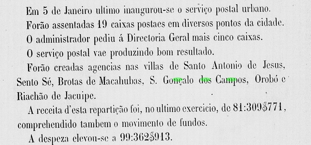 Auch die Postgeschichte dieser Ortschaft scheint unruhig gewesen zu sein. Im Verzeichnis der kaiserlichen Postämter (Tabella das Agencias do Correio do Imperio) von 1885 liest man, das örtliche Postamt entstand 1818. Das dürfte aber ein Druckfehler sein, denn Nova Monteiro schreibt in Administrações e Agencias Postaes do Brasil Imperio, (Brasil Filatelico/RJ, 1934-5; Reprint SPP 1994-1999) ein Datum dafür, das exakt 30 Jahre später liegt. Eine Pressenotiz aus Rio im Dezember 1848 bestätigt indirekt diese letzte Angabe: