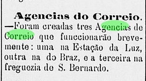 This locality had two imperial post offices. The older one was created some time before August 1875, located at the train station of the São Paulo Railway, which was built in February 1867. The second office was created in December 1879 – probably as a temporary substitute of the first – as reported by the local press: