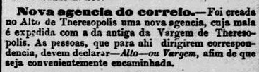 Die Lage wurde aber im Juli 1862 komplizierter, als laut Paulo Novaes (agenciaspostais.com.br) ein anderes Postamt im Santo Antonio do Paquequer eröffnete. Dieses schloss “ca. 1864” (P. Novaes) wieder ab, um im Oktober 1874 abermals zu öffnen, nun unter dem Namen Alto de Theresopolis, wie die Rio-Presse berichtet: