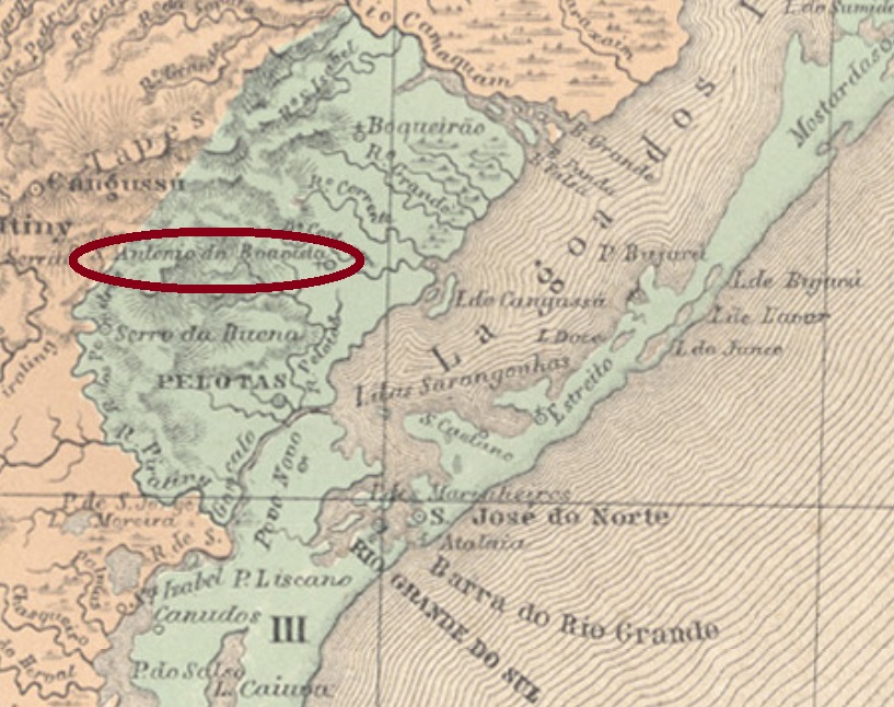 Santo Antonio da Boa Vista in the southern province of São Pedro do Rio Grande is another locality that seems to have vanished along the decades. It was a district of the municipality of Pelotas, situated over 200 km southwest of the province capital Porto Alegre and colonized mostly by german immigrants in late 19th century.
