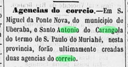 Nicht weniger als vier verschiedene Jahre wurden für das örtliche Postamt gefunden. Der Bericht der Directoria Geral dos Correios für 1859 nennt dafür das Jahr 1854. Nova Monteiro (Administrações e Agencias Postaes do Brasil Imperio, in Brasil Filatelico/RJ, 1934-5; Reprint SPP 1994-1999) listet die Agentur ab Juni 1855 auf. Paulo Novaes (agenciaspostais.com.br) schreibt Oktober 1861, und schließlich behauptet das Verzeichnis der kaiserlichen Postämter (Tabella das Agencias do Correio do Imperio) von 1885, das Postamt gibt es seit 1868. Wahrscheinlich blieb die Agentur einige Male zwischendurch geschlossen.