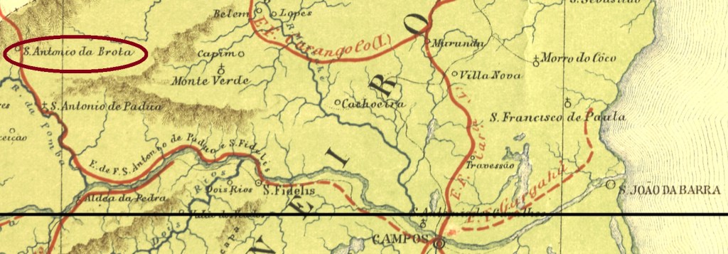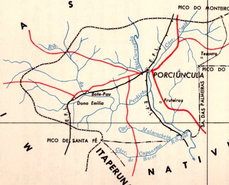 Hier haben wir mit einem merkwürdigen Fall zu tun: eine Ortschaft wechselt die Provinzzugehörigkeit, um von einem Bahnhof – mit eigenem Postamt – zu profitieren. Die Geschichte beginnt im April 1847, mit der Distriktgründung von Santo Antonio do Carangola im Município von São Paulo do Muriaé der Provinz Minas Gerais, über 250 km südöstlich der Hauptstadt Ouro Preto entfernt. Die Lage nahe an der Provinzgrenze zu Rio de Janeiro und die rasche Expansion des Bahnschienennetzes im späten 19. Jahrhundert haben offenbar einen großen politischen Druck in der Region erzeugt. Also wechselte die Ortschaft im November 1885 zum Município von Itaperuna, nun in die Provinz Rio de Janeiro, und schon sieben Monate später ein Bahnhof war dort durch die Estrada de Ferro do Carangola eingeweiht. Im November 1926 wechselte der Ortsname zu Santo Antonio de Porciúncula, der wiederum im Dezember 1938 zu Ponciúncula verinfacht wurde. Seit Juni 1947 hat Porciúncula einen eigenen Município. Der Name soll an den Arzt und Politiker José Tomás da Porciúncula (1854-1901) erinnern, den ersten gewählten Gouverneur des Staates Rio de Janeiro nach dem Putsch, der die Republik mit sich brachte.