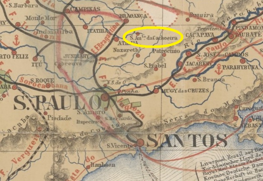 According to R. Koester (Carimbologia VII) there were two localities named Santo Antonio da Cachoeira in the São Paulo province during the Brazilian Empire. The first one would be the actual Cachoeira Paulista, on the road to Rio de Janeiro. The other one is presented here: the former and actual Piracaia, situated in the Bragança region, round 100 km north of the provincial capital. Founded as the freguesia of Piracaia in March 1836 in the municipality of Atibaia, it switched to Nazareth in June 1850 and emancipated in March 1859 as the villa of Santo Antonio da Cachoeira. In March 1885 it was declared a town, which was called back to Piracaia from August 1906 on. The tupi word means roast fish.