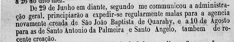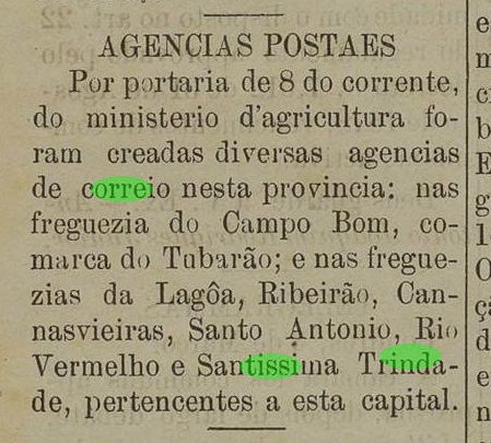 Two dates for the the local post office were found. According to the Imperial Mail Register (Tabella das Agencias do Correio do Imperio) of 1885 it was created already in 1877, but the Provincial President’s Report for 1879 (Relatório do Presidente da Provincia) asserts it began to operate only in August 1878: