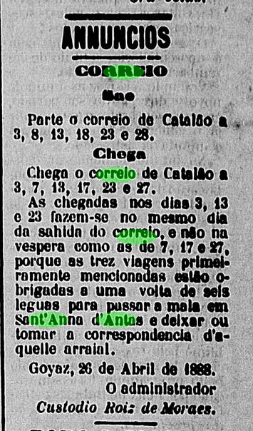 Laut Verzeichnis der kaiserlichen Postämter (Tabella das Agencias do Correio do Imperio) von 1885 entstand 1862 das örtliche Postamt. Da aber der Ort zu der Zeit noch Lagoa Vermelha hieß und woanders lag, können wir annehmen, dass die Postdienste durch den Umzug nicht unterbrochen wurden. Kein Stempel aus der Kaiserzeit wurde bisher gesichtet.