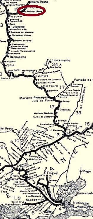 Der Bahnhof Rodrigo Silva wurde im Januar 1888 in der Ouro Preto Abzweigung der Estrada de Ferro D. Pedro II gegründet und lag ca. 20 westlich der Provinzhauptstadt Ouro Preto entfernt. Der Name zollte Tribut an einen brasilianischen Politiker, Jurist und Journalist aus São Paulo (1833-1889). Nach dem Ende des Kaiserreichs wurde die Bahngesellschaft auf Estrada de Ferro Central do Brasil umbenannt. In 1964 ging die Linie in Besitz der Estrada de Ferro Leopoldina, und in 1975 – bis zum Betriebsende in 1996 – zur Rede Ferroviária Federal S. A. (estacoesferroviarias.com.br). Um den Bahnhof herum wuchs der Distrikt Rodrigo Silva, der bis heute existiert, mit knapp über eintausend Einwohnern.