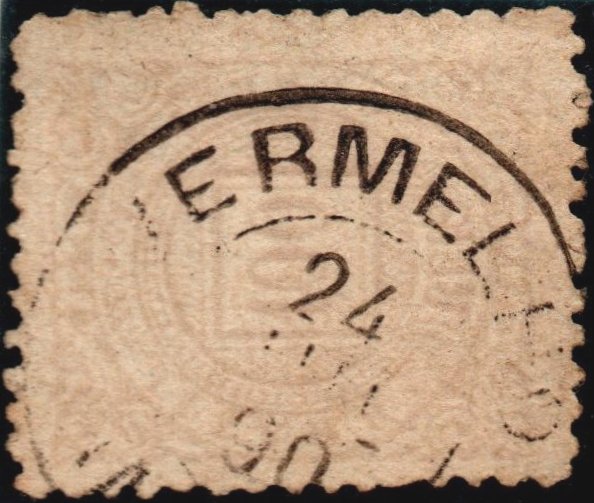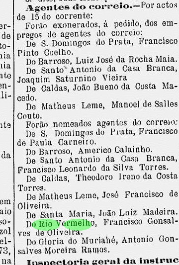 Two cancels are known: RMG-2170a (Coll. José A. Junges) has a double circle with the inscription RIO VERMELHO above and a diamond ornament below, which consists of four small leaflets. Dates found for 1885-1896. RMG-2170b (Coll. José A. Junges) may be already republican, for one sole copy was found, dated 1890. It has a double circle with the inscriptions R. (or RIO, the image is unfortunately unclear) VERMELHO above and (MINAS) below, with date in the centre.