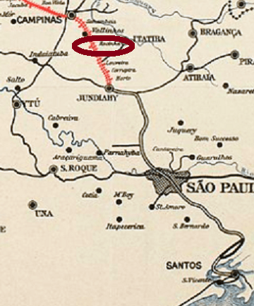 The Rocinha (= Tiny Field) train station of the Companhia Paulista de Estradas de Ferro Railway main line was built in March 1872 under the name Cachoeira (= Water Fall) in the municipality of Jundiaí, about 80 km northwest of the province capital São Paulo. The name had to change after 1875 to Rocinha, because another Cachoeira train station (today: Cachoeira Paulista) was then built in the important rail line between São Paulo and Rio.